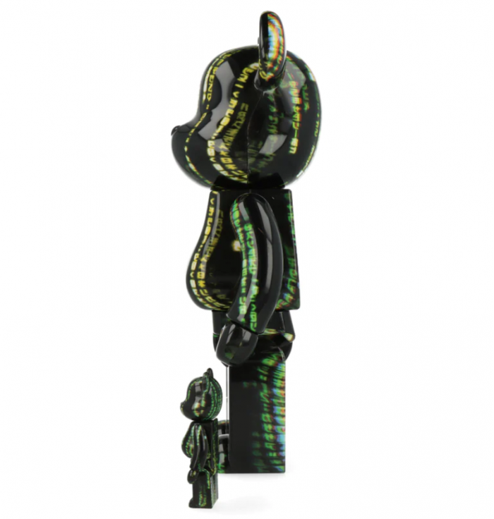 Sur ce set 400% et 100% Beabrick à fond noir, on retrouve un flux de code binaire. La disposition du motif est aléatoire, ce qui rend chaque figurine unique.