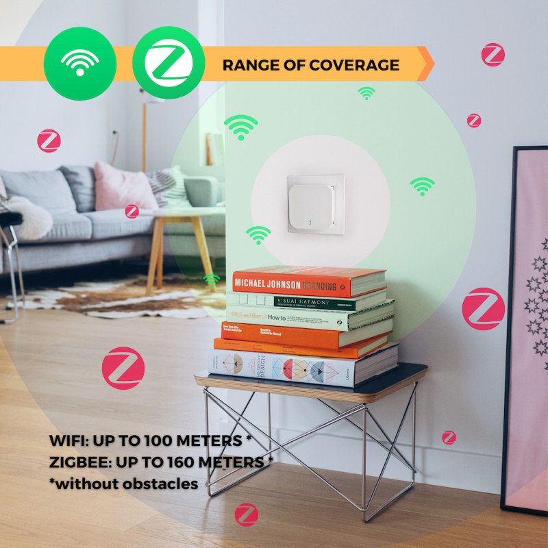 Portée de fonctionnement : WiFI : 50 mètres maximum (zone vide), ZigBee : 90 mètres maximum (zone vide)