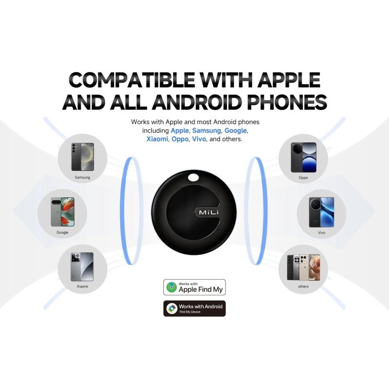 Le MiLi MiTag Duo est un tracker Bluetooth universel conçu pour vous aider à retrouver facilement vos objets du quotidien. Ce modèle se distingue par sa double compatibilité avec les réseaux Apple Find My et Google Find My Device, ce qui en fait une solution idéale aussi bien pour les utilisateurs iPhone que pour les utilisateurs Android. MiLi le présente comme un tracker compatible iOS et Android, certifié pour fonctionner avec l’un ou l’autre écosystème.